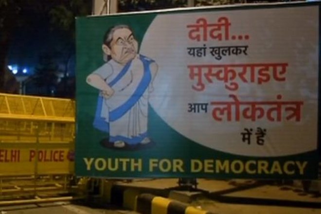 भाजपा के खिलाफ विपक्ष की महारैली से ठीक पहले दिल्ली में यूथ ऑफ डेमोक्रेसी नाम की ओर से लगाए गए पोस्टर्स में लिखा है, ‘दीदी यहां खुलकर मुस्कुराइए, आप लोकतंत्र में हैं।’