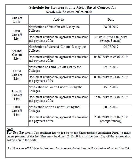 मेरिट के आधार पर यूजी कोर्स के लिए पहली कट ऑफ लिस्ट 28 जून को आने वाली है और इसी के आधार पर 28 जून से लेकर 1 जुलाई तक एडमिशन प्रोसेस चलेगा। इस दौरान स्टूडेंट के डॉक्युमेंट का वेरिफिकेशन, एडमिशन की मंजूरी और फीस भरने का प्रोसेस होगा।