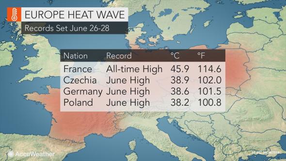 खबरों के मुताबिक फ्रांस के मौसम विभाग ने बताया कि वहां के एक गांव विलेविएले में 45.1 डिग्री तापमान दर्ज किया गया है। इससे पहले इस यूरोपीय देश में सबसे गर्म सीजन अगस्त, 2003 में दर्ज किया गया था। तब फ्रांस के मॉन्टपेल्लियर में गर्मी से पारा 44.1 डिग्री पर पहुंच गया था।
