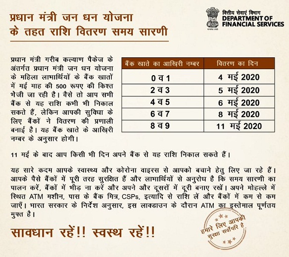 लॉकडाउन के बीच सरकार ने गरीबों की मदद के लिए एक और राहत दी है। आने वाले सोमवार से महिला जनधन खाताधारकों के खातों में 500 रुपये की सरकारी सहायता की दूसरी किस्त मिलना शुरू हो जाएगी। वित्तीय सेवा सचिव देवाशीष पांडा ने ट्वीट के जरिए इस मामले में जानकारी दी है।
