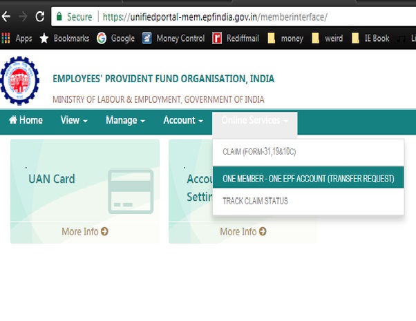 लॉगिन के बाद वेबसाइट के होम पेज पर ‘ऑनलाइन सर्विसेज’ ऑप्शन पर जाएं। ड्रॉप डाउन मैन्यू से ‘वन मेंबर-वन ईपीएफ अकाउंट ट्रांसफर रिक्वेस्ट’ पर क्लिक करें।