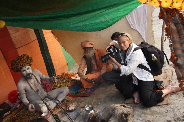 कुंभ मेले के साधुओं में से एक, जूना अखाड़े के महंत शक्ति गिरि आकर्षक धूप के चश्मा लगाए बैठे हैं।