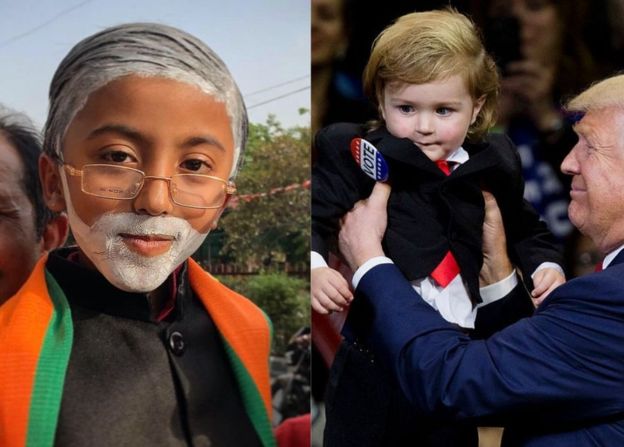 रैली का नजारा यह होता है कि बच्चे भी इसमें भाग लेते हैं। माता पिता बच्चों को मोदी बनाकर या मास्क पहनाकर ऐसा करते हुए नजर आते हैं। फोटो में आप यही देख पा रहे हैं। ऐसा ही नजारा ट्रम्प की रैलियों का होता था। ट्रम्प जैसा बच्चों को तैयार किया जाता था।