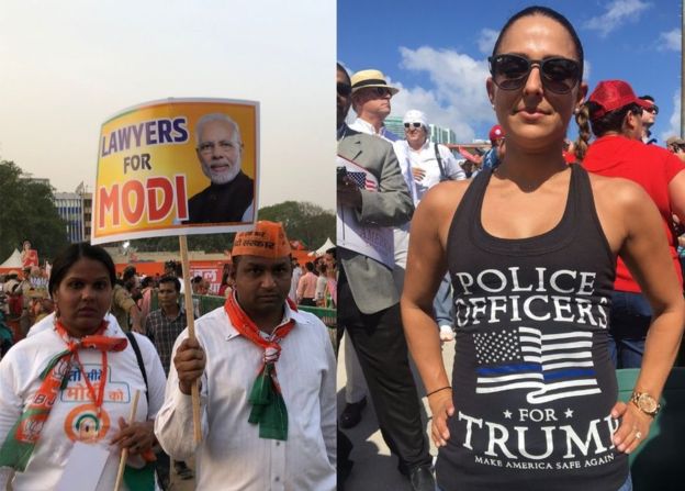 नरेन्द्र मोदी की रैली में देशभक्ति के गाने उफान पर होते हैं। जैसे ही हम रैली मैदान में प्रवेश करते हैं, सीटें भरनी शुरू हो जाती हैं। ट्रम्प और नरेन्द्र मोदी का आधार वे इसी तरह से रखते हैं जैसे वे आम जनता से वास्ता रखते हैं।