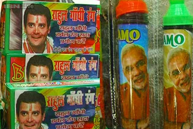 चुनाव में सबसे अहम दो पार्टियां है बीजेपी और कांग्रेस। होली के प्रोडक्ट्स में भी इन दो पार्टियों को जगह दी गई है। एक तरफ जहा पिचकारियों पर मोदी की फोटो नज़र आ रही है, वहीं दूसरी तरफ हर्बल रंगों पर राहुल नज़र आ रहे हैं, यानी राहुल के आने से आपको किसी तरह का नुकसान नहीं होगा। इसके अलावा प्रियंका गांधी, योगी और अमित शाह भी रंगों के बाज़ार में मौजूद हैं।