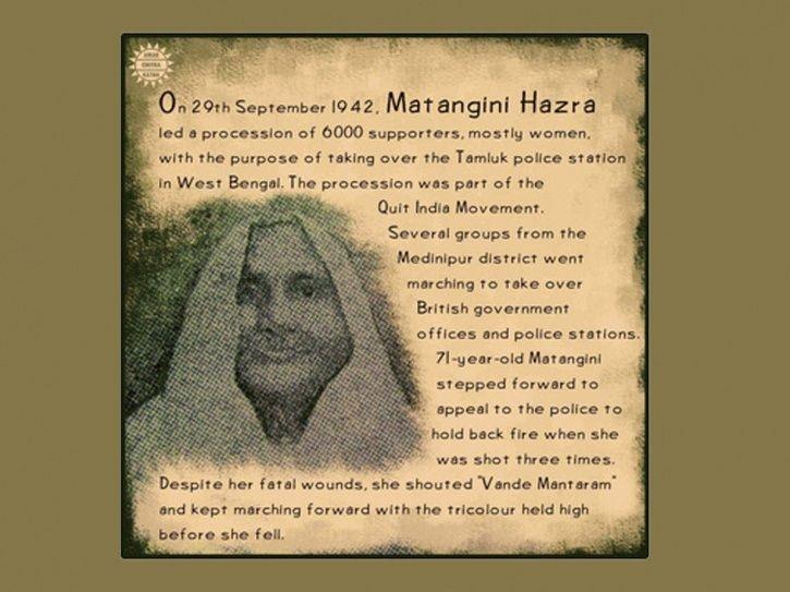 अंग्रेजी शासन से देश को मुक्त कराने के लिए भारतीय स्वतंत्रता आंदोलन में पुरुषों के साथ कदम से कदम मिलाकर कई भारतीय महिलाओं ने भी अपने जीवन का बलिदान किया था। ऐसी ही बहादुर महिलाओं में से एक थी मातंगिनी हाजरा। मातंगिनी को सम्मान से ‘गांधी बूढ़ी’ और बंगाल की ‘ओल्ड लेडी गांधी’ नाम से भी पुकारा जाता है। महान भारतीय क्रांतिकारी वीरांगना मातंगिनी हाजरा की 19 अक्टूबर को 153वीं जयंती है। इस खास अवसर पर जानिए उनके प्रेरणादायक जीवन के बारे में कुछ अनसुनी बातें…