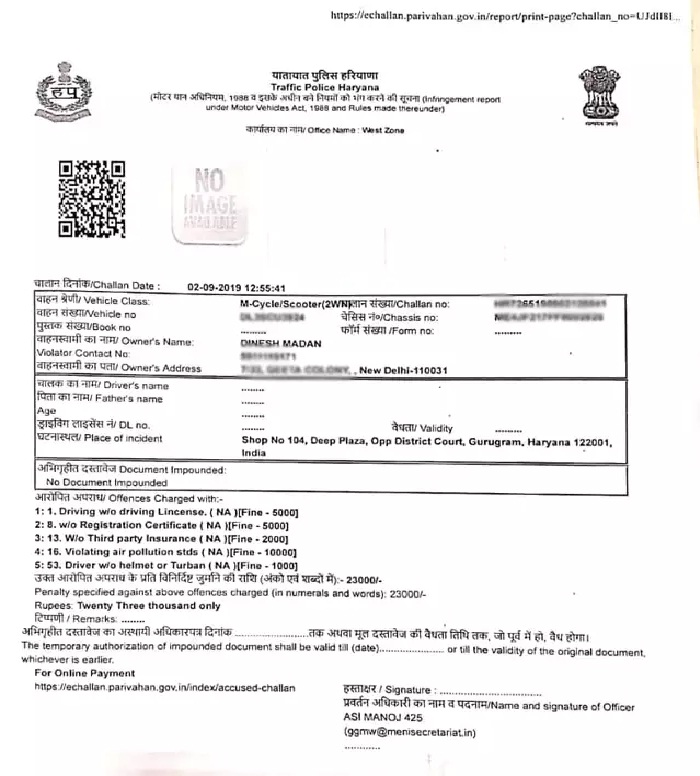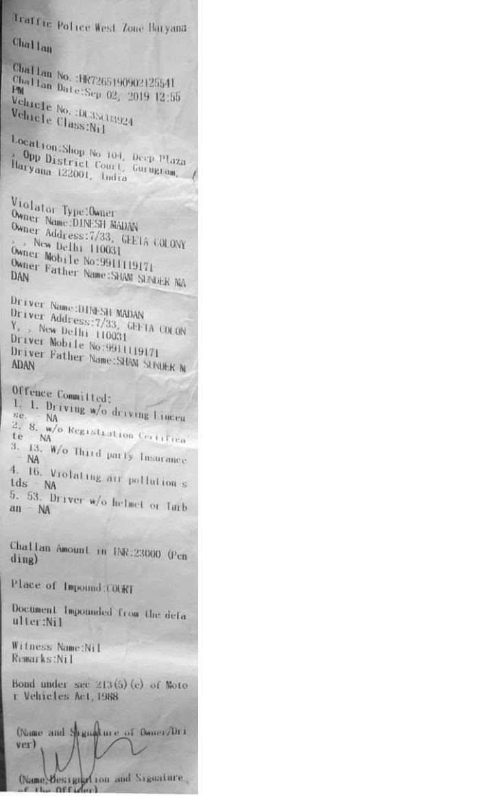 दरअसल ये मामला है दिल्ली की गीता कॉलोनी में रहने वाले दिनेश मदान का। मीडिया रिपोर्ट्स के मुताबिक दिनेश अपने किसी काम से गुड़गांव गए थे। जहां जिला अदालत कॉम्पलेक्स के निकट उन्होंने हेलमेट उतार दिया। वहां खड़े पुलिसकर्मियों की नजर दिनेश पर पड़ी। उनसे गाड़ी के कागजात मांगे। कागजात नहीं दिखाए जाने पर पुलिसकर्मियों ने 23 हजार रुपए का चालान कर दिया।
