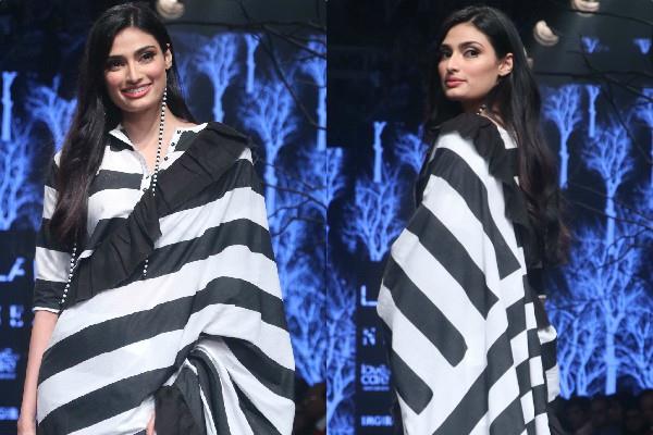 अथिया शेट्टी ने अब्राहम ऐंड ठाकुर लेबल की शो स्टॉपर थी। अथिया ने ब्लैक ऐंड वाइट कलर की मोनोक्रोमैटिक स्ट्राइप फ्रिल वाली साड़ी में वॉक किया।