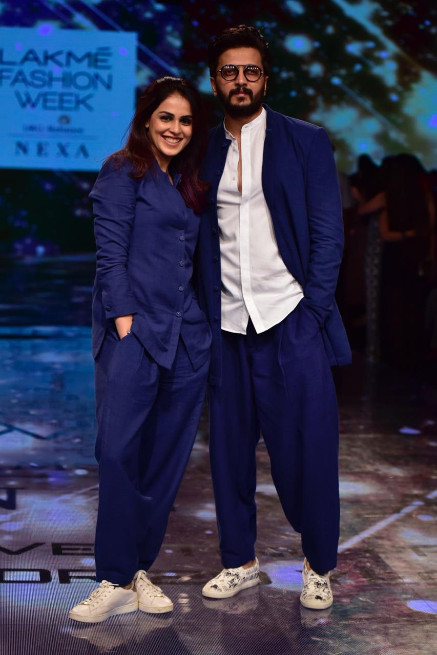 ऐक्टर रितेश देशमुख अपनी पत्नी जेनेलिया डिसूजा के साथ रैंप पर नजर आए। शो में रितेश और जेनेलिया ने ब्लू कलर की लूज फिटिंग पैंट्स और ब्लू शर्ट पहनी थी।