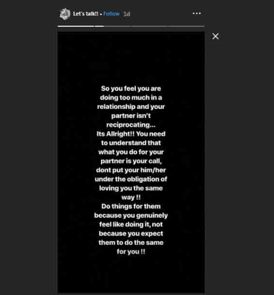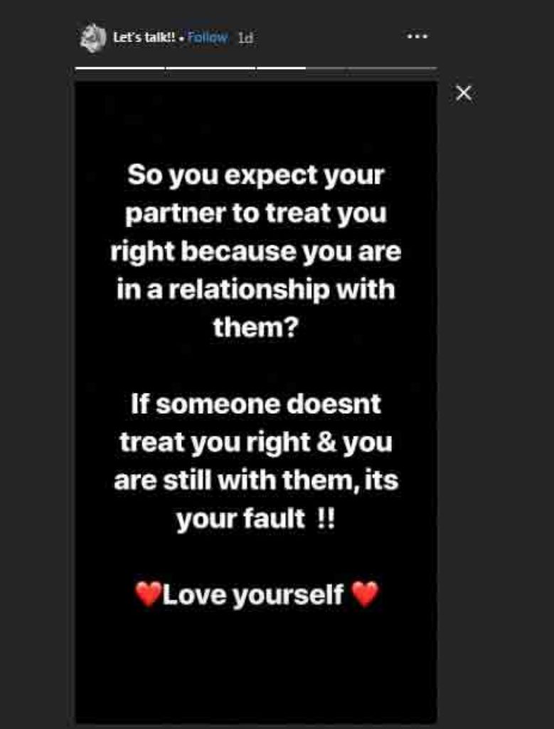 उन्होंने आगे लिखा, “अच्छा तो आप उम्मीद कर रहे हैं कि अगर आप उनके साथ रिलेशनशिप में हैं तो वह आपको अच्छे से ट्रीट करें? अगर वह आपको अच्छे से ट्रीट नहीं कर रहा है और आप फिर भी उसके साथ हैं तो यह आपकी गलती हैं खुद से प्यार करों”