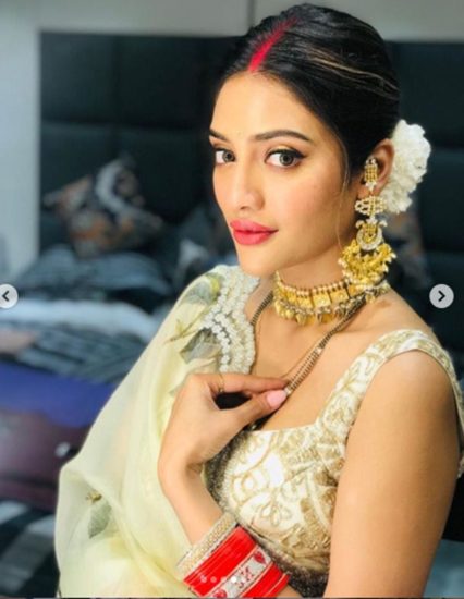 फोटोज में नुसरत सिंदुर और लाल चूड़ा पहने नज़र आ रही हैं। साथ ही उन्होंने बन बनाकर गजरा लगा रखा है। आईने के सामने नुसरत की यह फोटोज उनके फैंस का दिल जीत रही हैं। नुसरत ने अपने पति निखिल जैन के साथ भी एक फोटो शेयर की है। आइए आपको नुसरत की कुछ फोटोज दिखाते हैं…।